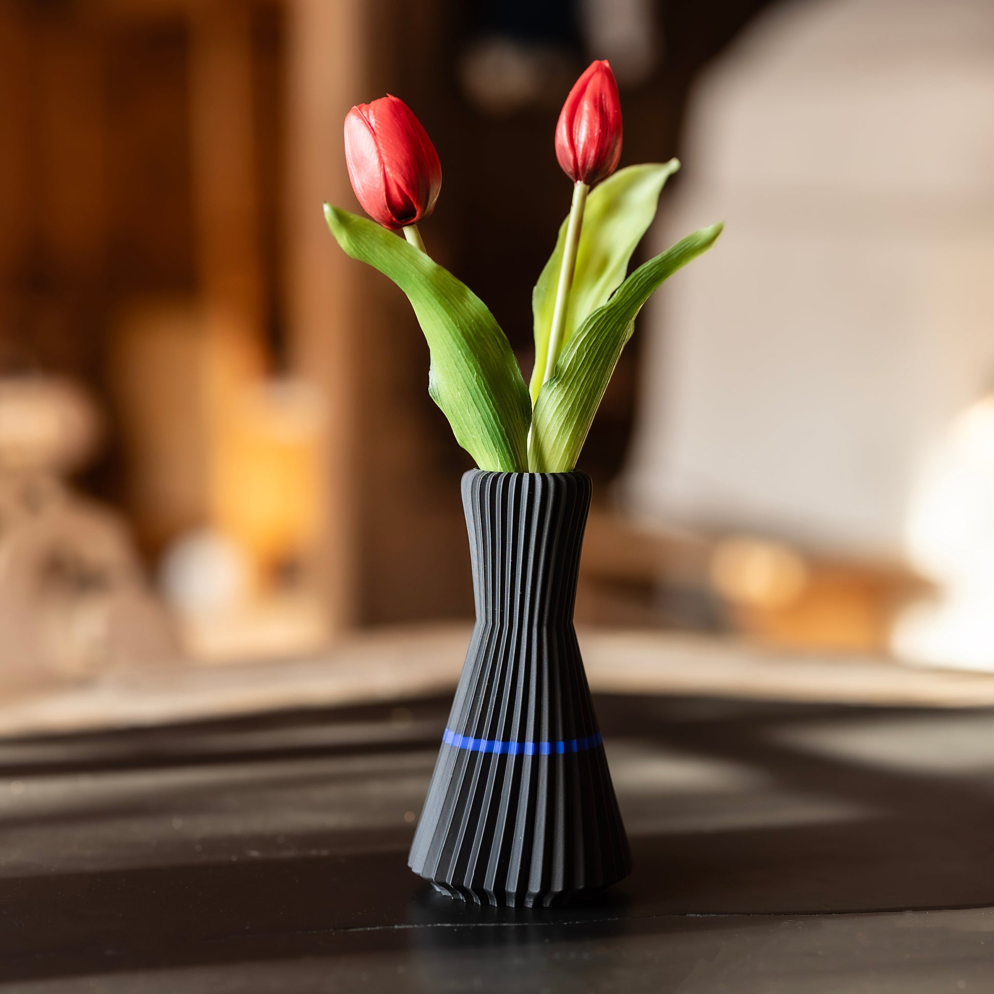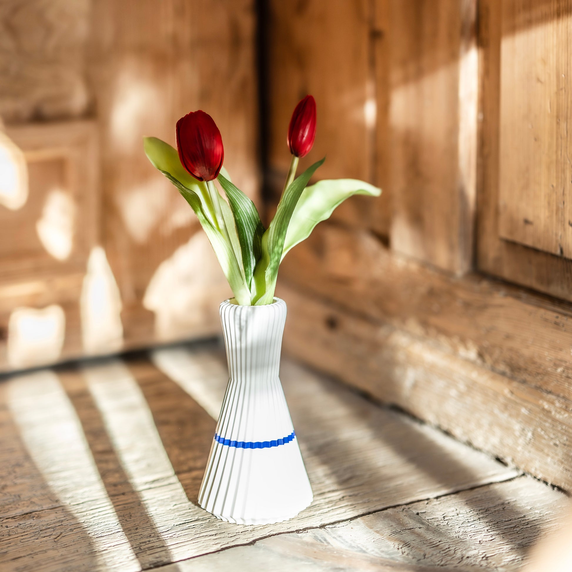 Das verwendete Material PLA ist temperaturempfindlich. Daher darf die Vase keinem direkten Sonnenlicht und keinen Temperaturen über 40 Grad ausgesetzt werden. Wir empfehlen daher eine Verwendung im Innenbereich.