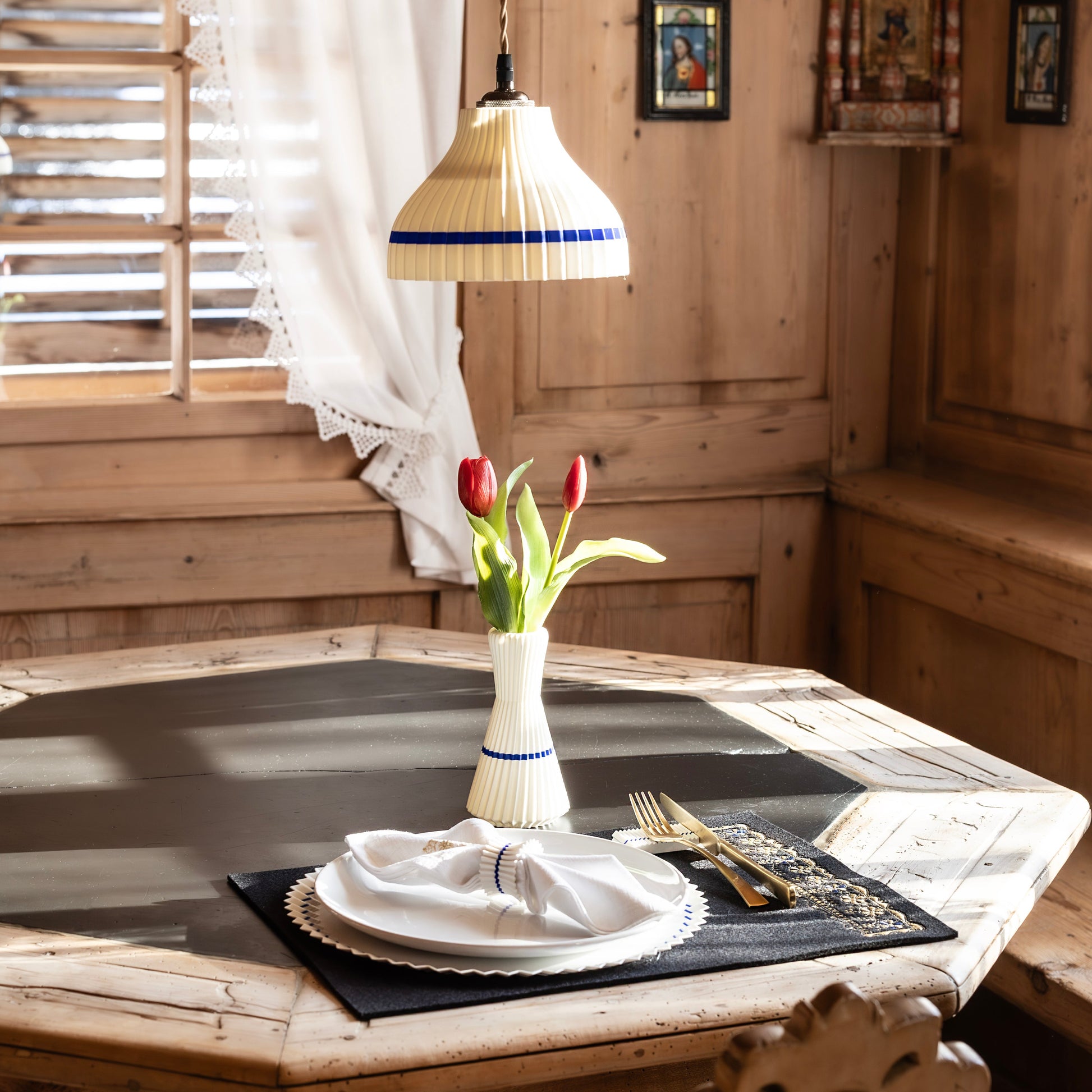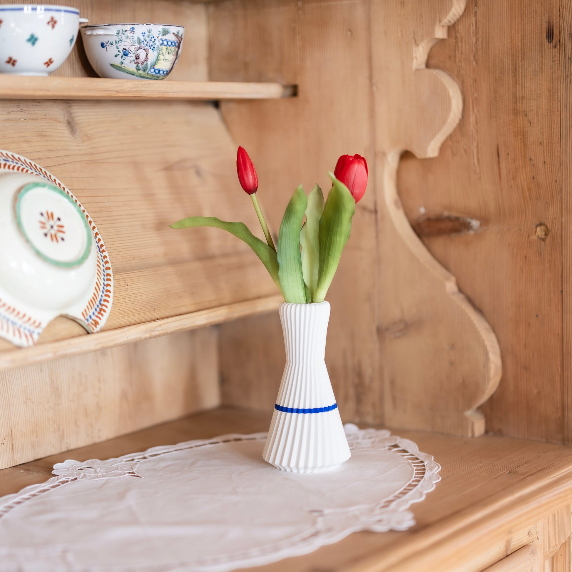 Die geschwungene Silhouette und die fein strukturierte Oberfläche sind von den charakteristischen Falten der klassischen Juppe inspiriert und verleihen der Vase eine besondere Dynamik und Eleganz.